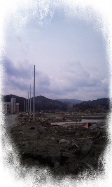 壊れた道路とこわれた電柱 が立てられながら